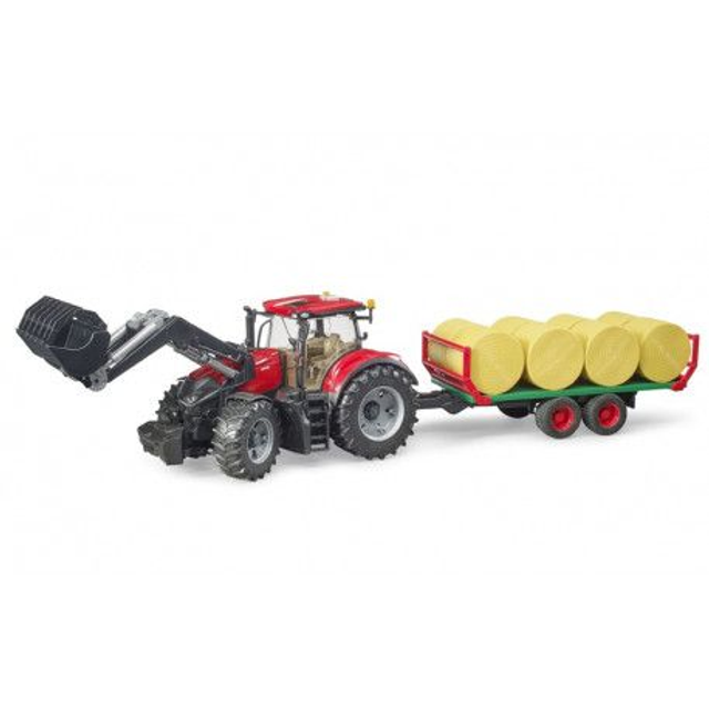 Tracteur Case IH Optum 300 CVX avec chargeur frontal et plateau à paille avec balles rondes reproduits en jouets Bruder robustes et fonctionnels à l'échelle 1/16.